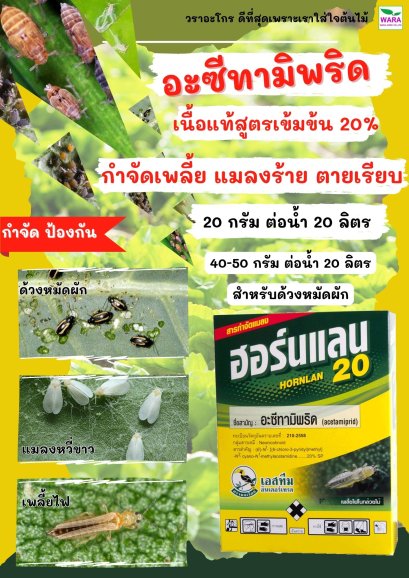 ฆ่าด้วงหมัดผัก แมลงหวี่ขาว เพลี้ยอ่อน เพลี้ยไฟ เพลี้ยกระโดด หยุดใบหงิก ใบหด เนื้อแท้เข้มข้น อะซีทามิพริด20 ฮอร์นแลน20